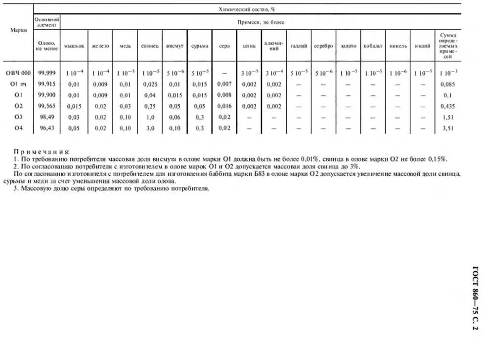 Олово марки О4 – высококачественный металл, содержащий не менее 96,4% чистого олова. В данной марке присутствуют примеси других элементов, таких как свинец, висмут, сурьма, медь и другие. Однако их количество строго регламентировано стандартом качества ГОСТ 860-75.